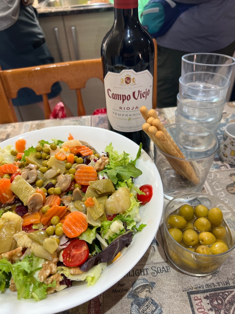 Had a great rest day in Logroño yesterday. We stayed in a nice little apartment in town, and just walked around the town. Logroño is a big city, about the same size as Pamplona, with lots of cars and a ton of eateries. We chose to buy food and wine at the grocery and cook our own meals while in town. Mike made us his famous breakfast tacos which were delicious, and we also made our dinner together and had a nice salad, pasta, pesto bread… with Tempranillo of course! We had a nice relaxing day/evening on the rooftop patio of our apartment. It made for a relaxing day for the three of us and gave our bodies time to recoup from the daily hikes. It’s really important to incorporate these rest days into your walk so your body gets a little breather from the continuous hiking/walking each day brings.