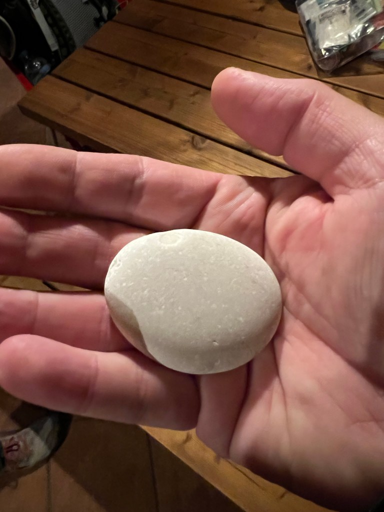 This is my rock. I brought it from home and have carried it with me the whole journey. I’ve actually been carrying it with me, metaphorically, for over two years and sometimes, it feels like it weighs 1,000 pounds. It represents unmeasurable grief, sadness, anger, and pain that sometimes prevents me from being happy or moving forward. It doesn’t need any words written on it. I know what it represents.